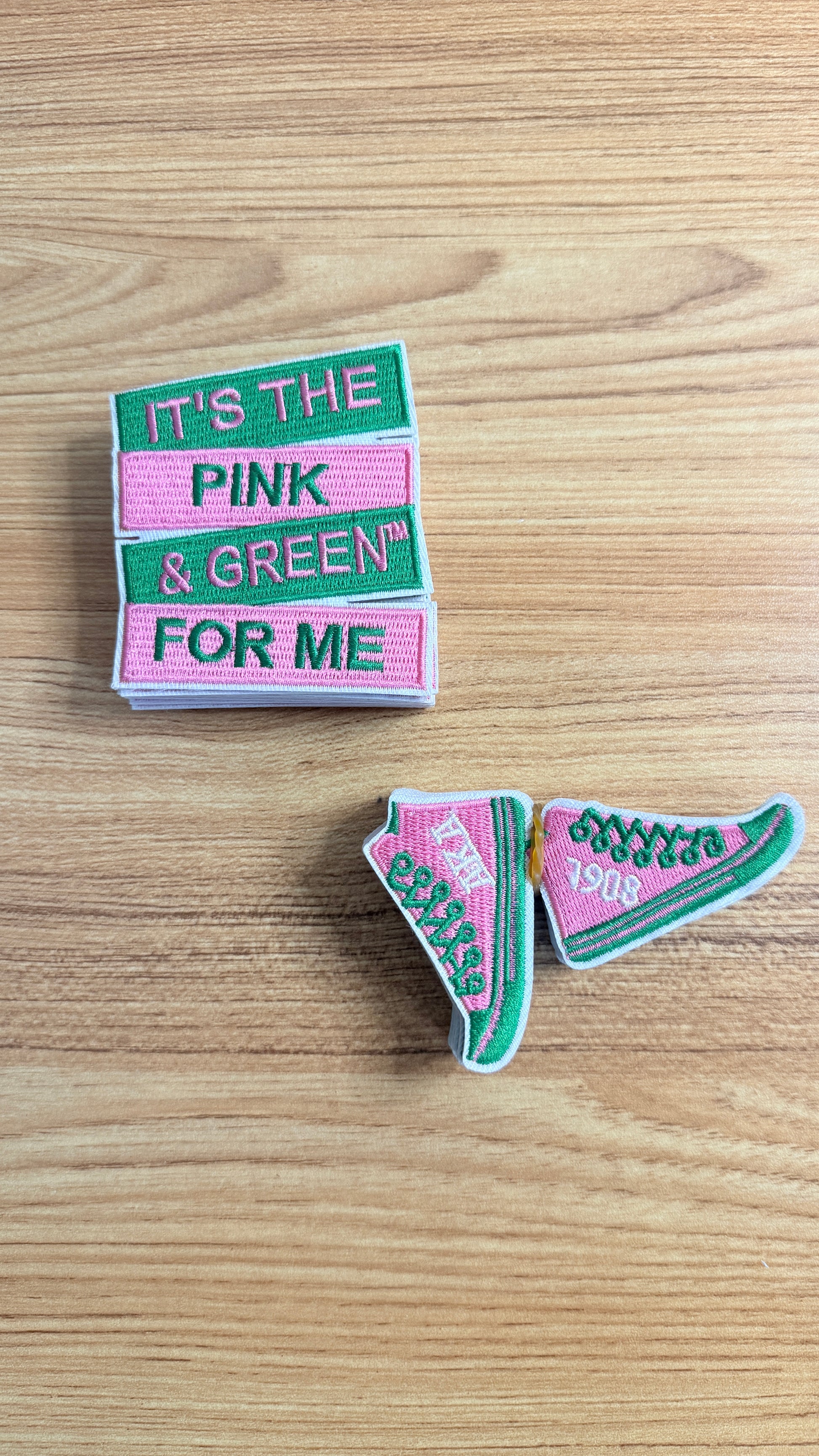 This AKA iron-on patch set celebrates Alpha Kappa Alpha pride with vibrant pink and green designs, featuring the phrase “It’s the Pink and Green for Me” and stylish sneaker imagery. Easy to apply and durable, these patches are perfect for jackets, bags, hats, and custom sorority gear.