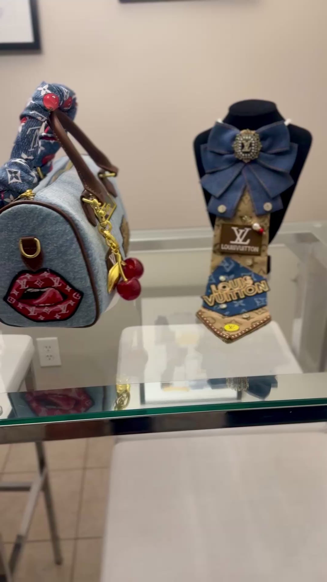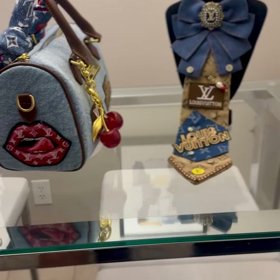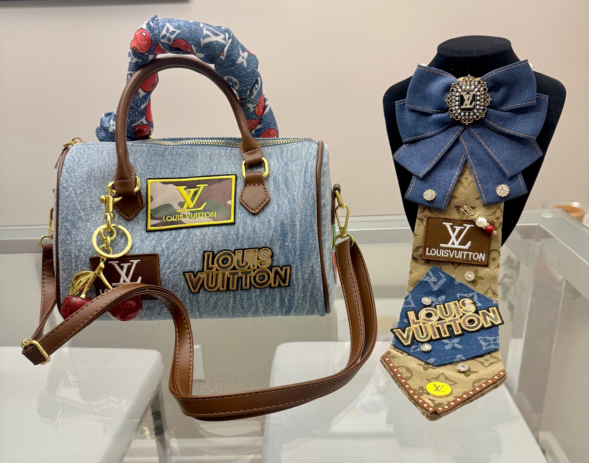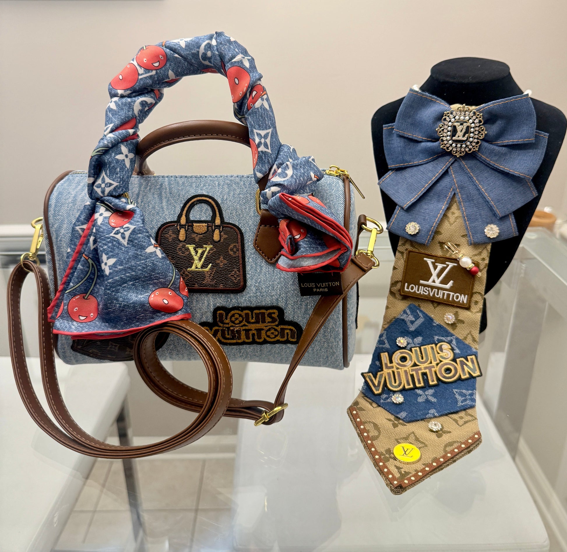TM Freestyle handbag and Tie Combo. This set comes with speedy bag and Tie. Both are very unique. The Tie is brown and green material with inspired brand accessories. The purse is a speedy denim bag with brand accessories. You can also use this purse as a crossbody. Comes with a long brown purse strap.