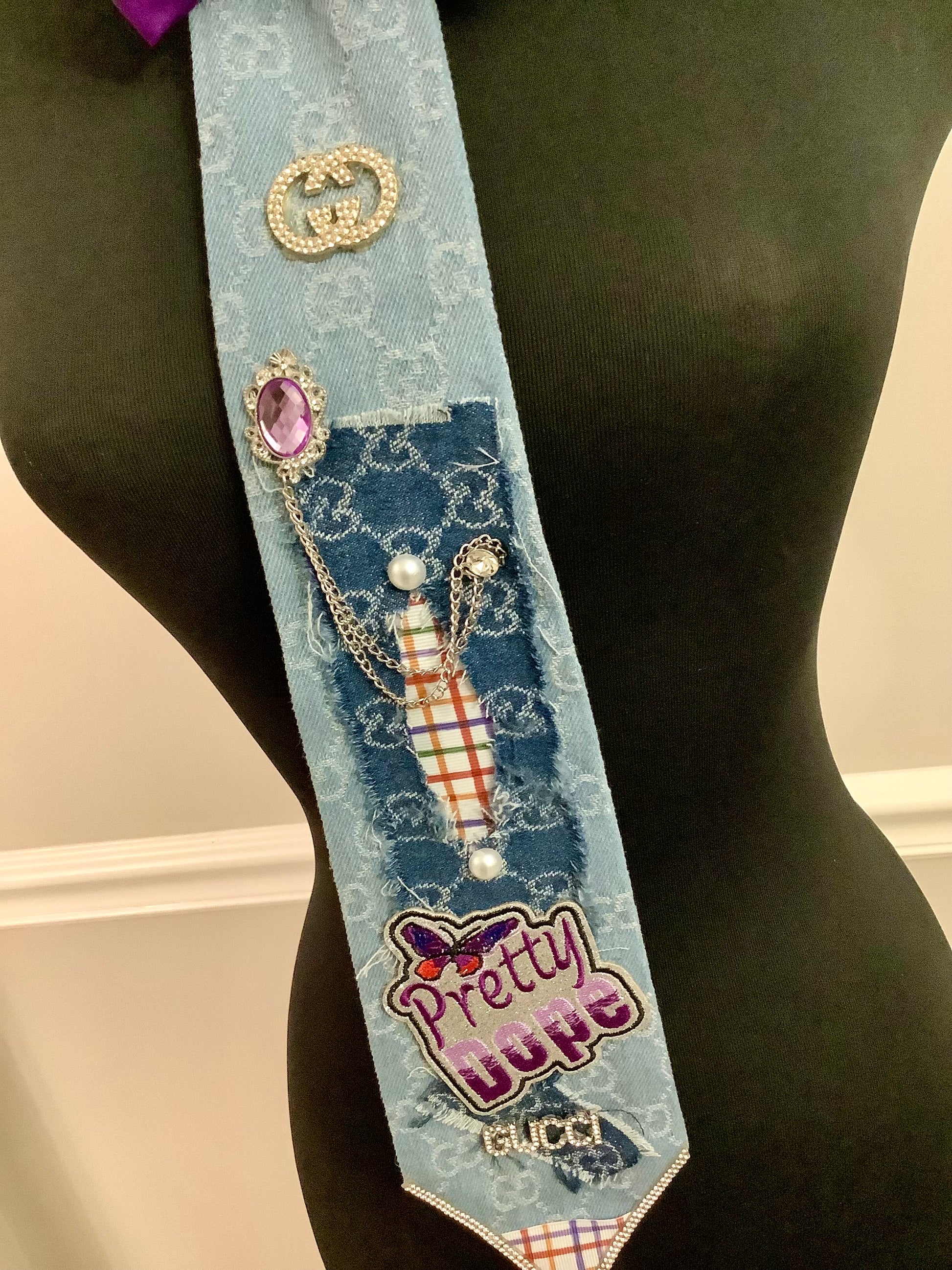 Neckties are the newest trend with a combination of fashion and elegance. This tie is denim with purple accessories. This tie will pair well with denim. One of a kind.