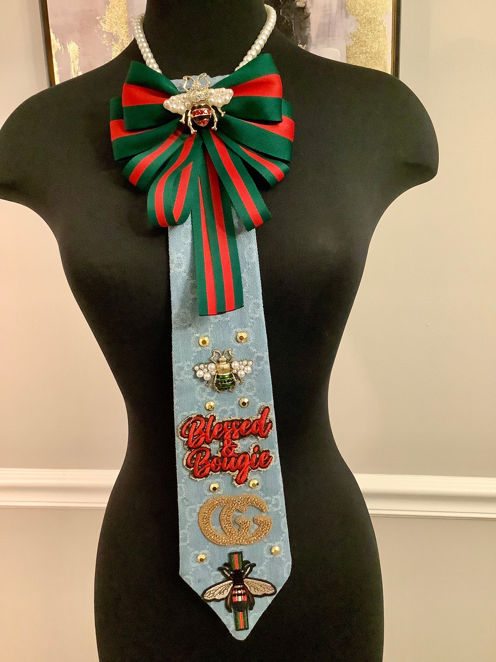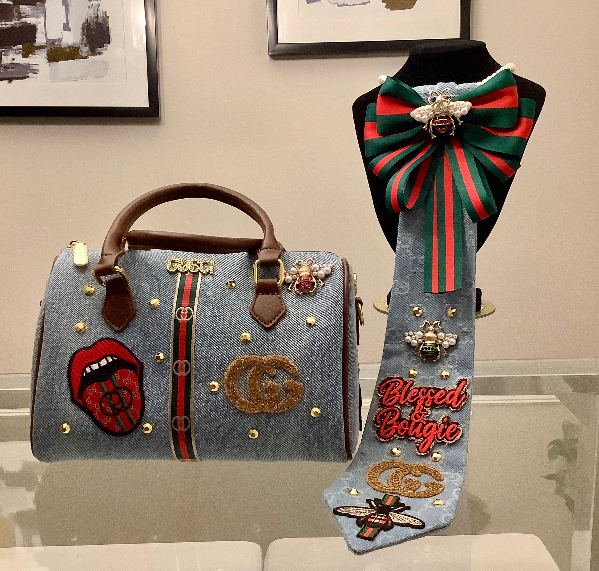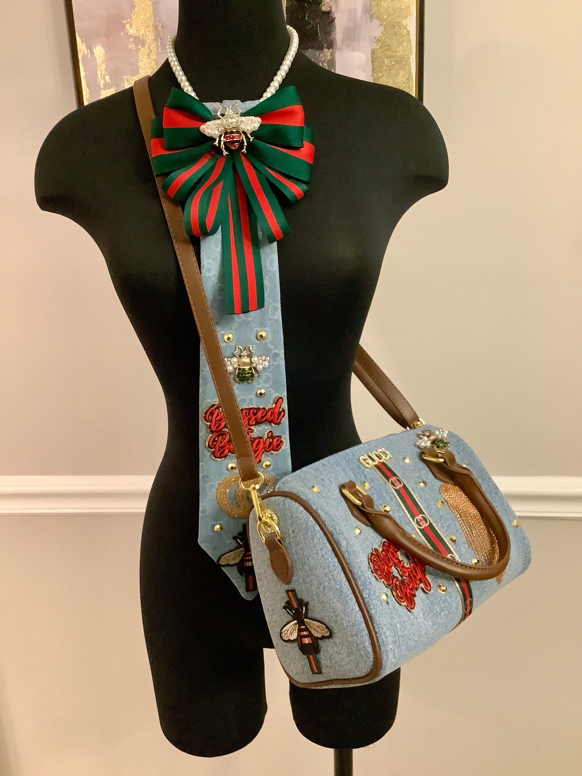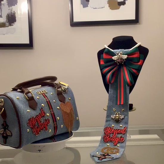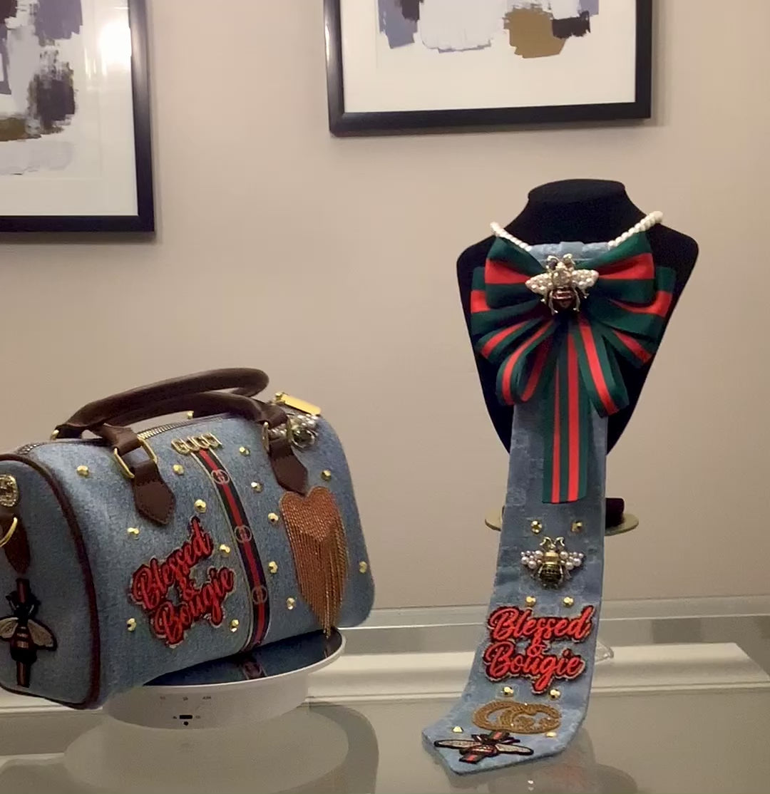TM Freestyle handbag and Tie Combo. This set comes with speedy bag and Tie. Both very unique. The Tie is denim with inspired brand accessories. The purse is a speedy denim bag with brand accessories. You can also use this purse as a crossbody. Comes with a long brown purse strap.