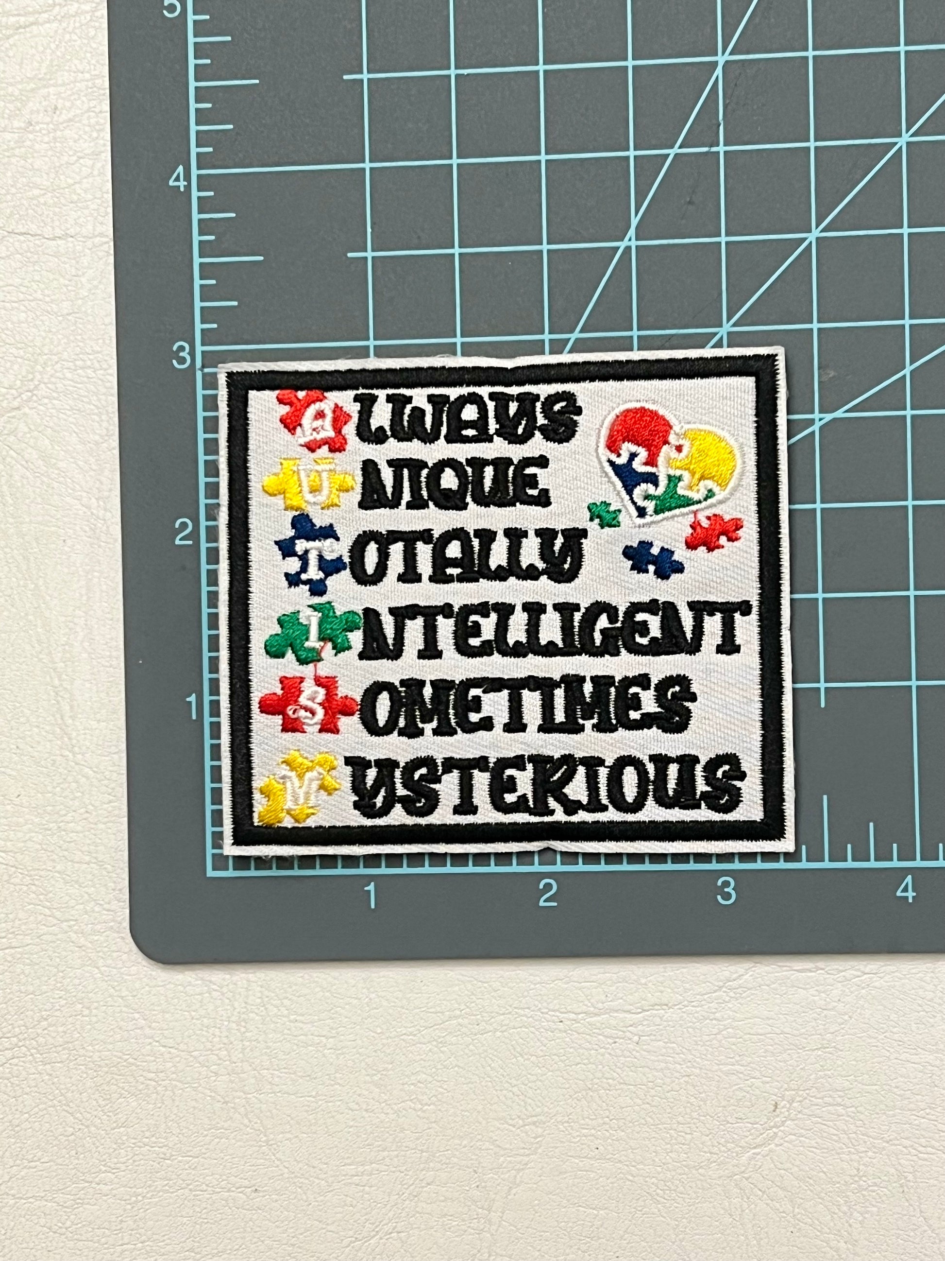 A beautifully empowering patch featuring the uplifting acronym “Always Unique, Totally Intelligent, Sometimes Mysterious.” Perfect for celebrating autism pride, individuality, and the strength found in neurodiversity.